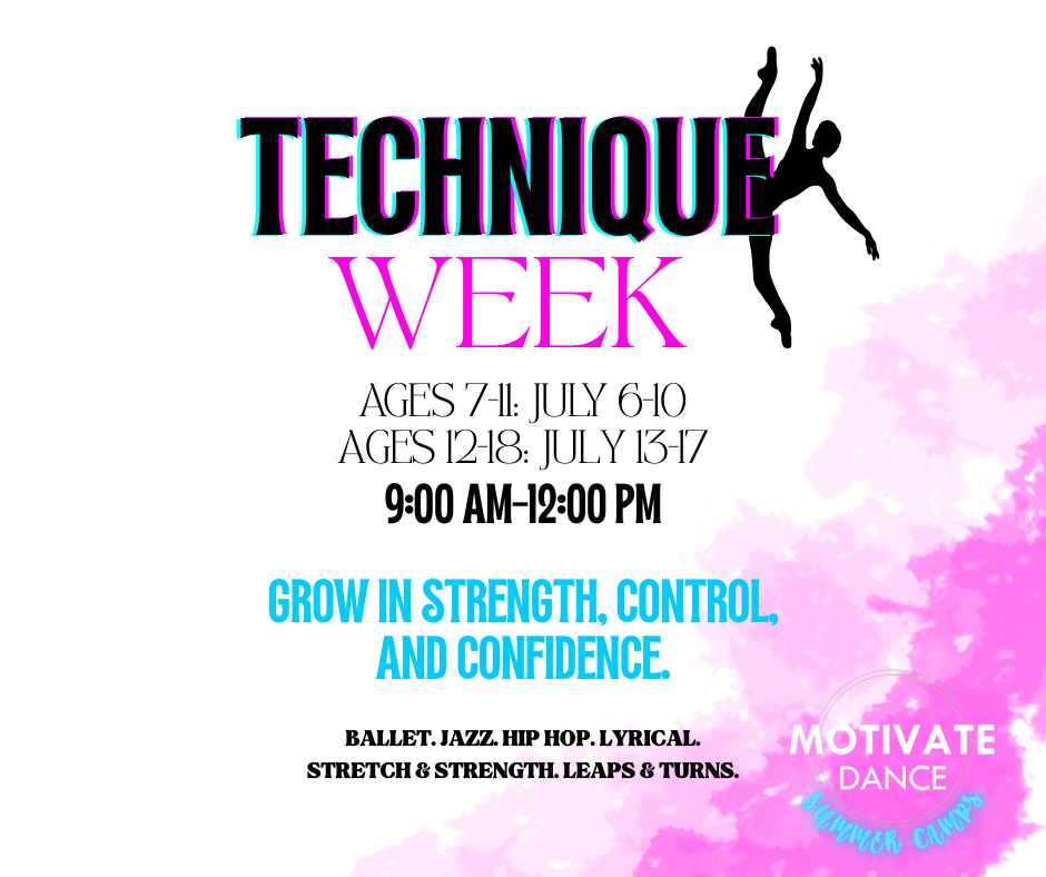 Technique Week is a 5-day summer intensive designed to help dancers strengthen their foundation and refine their skills in a focused, encouraging environment.