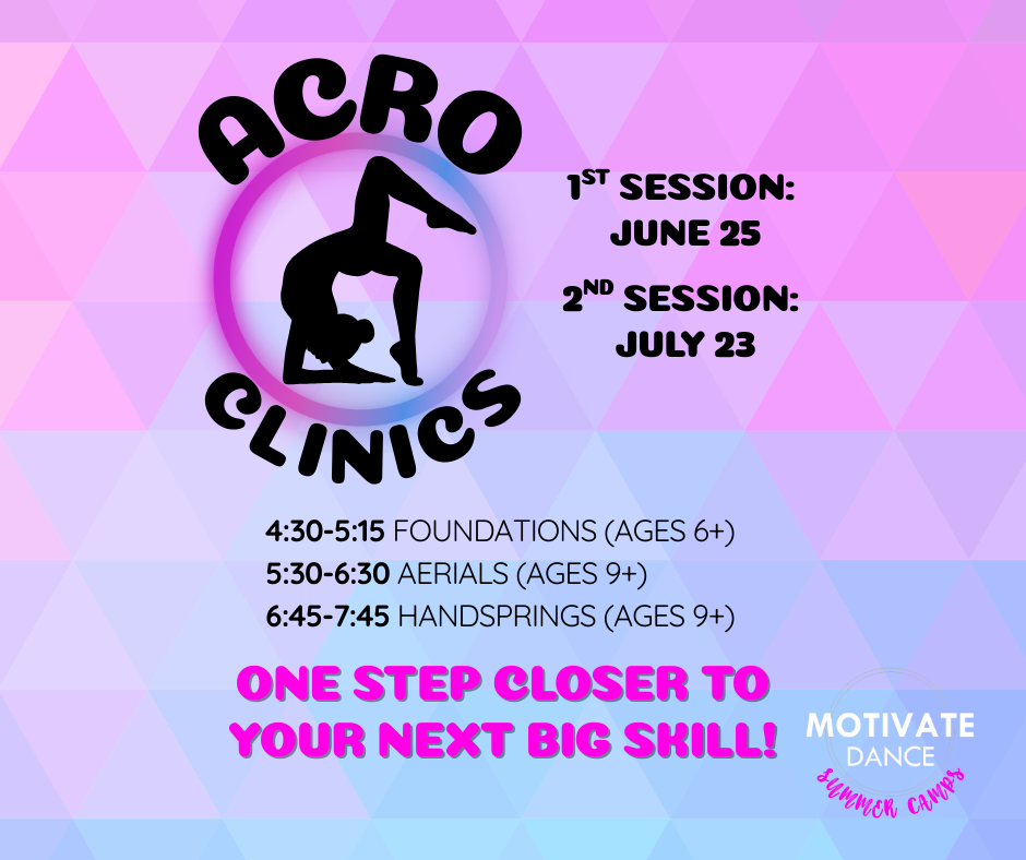 Our Acro Clinics are designed to help dancers safely develop and refine key acrobatic skills through targeted instruction and conditioning. We offer three focused clinic options: