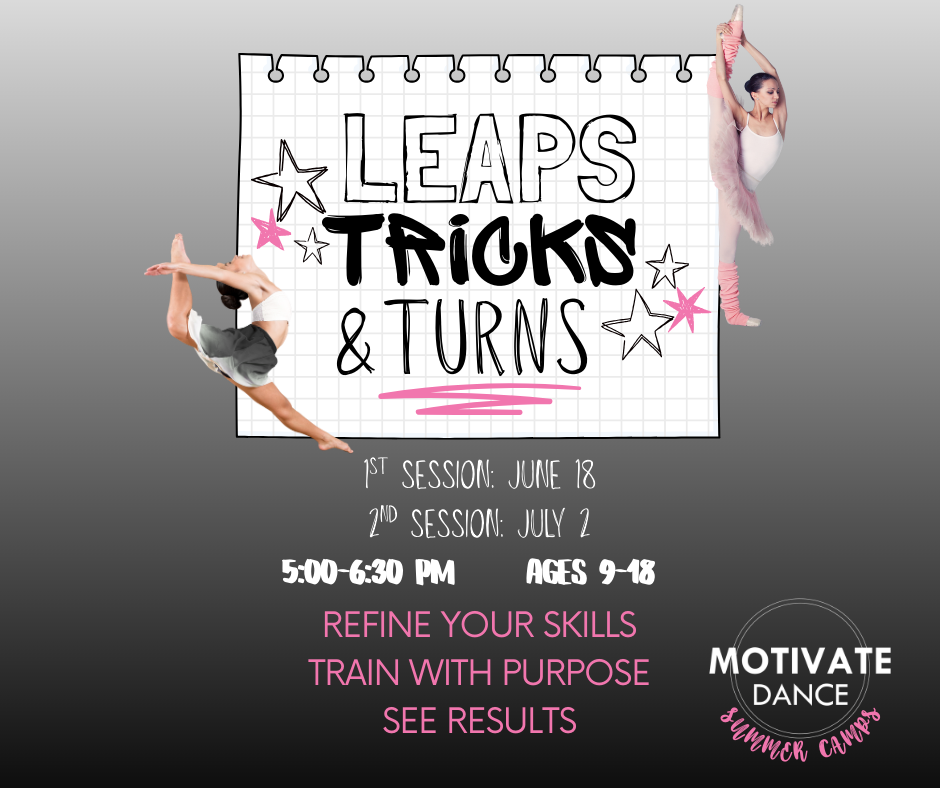 Our Leaps, Tricks & Turns Clinic is a high-energy, technique-focused training designed for dancers ages 9–18 who are ready to grow.